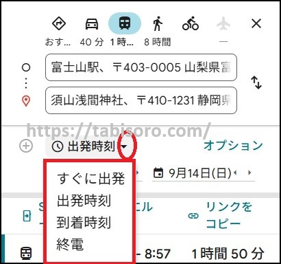 「すぐに出発・出発の時間・到着時刻・終電」 を選び「時刻・日付」を指定することによりより予定に近い時間を表示できます。