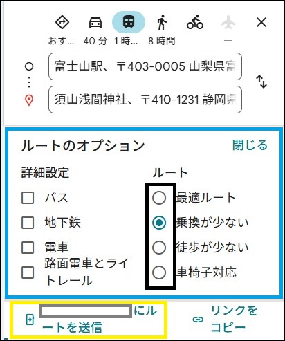 画像は、電車(バス)が青丸になっているので 電車(バス)での行き方です