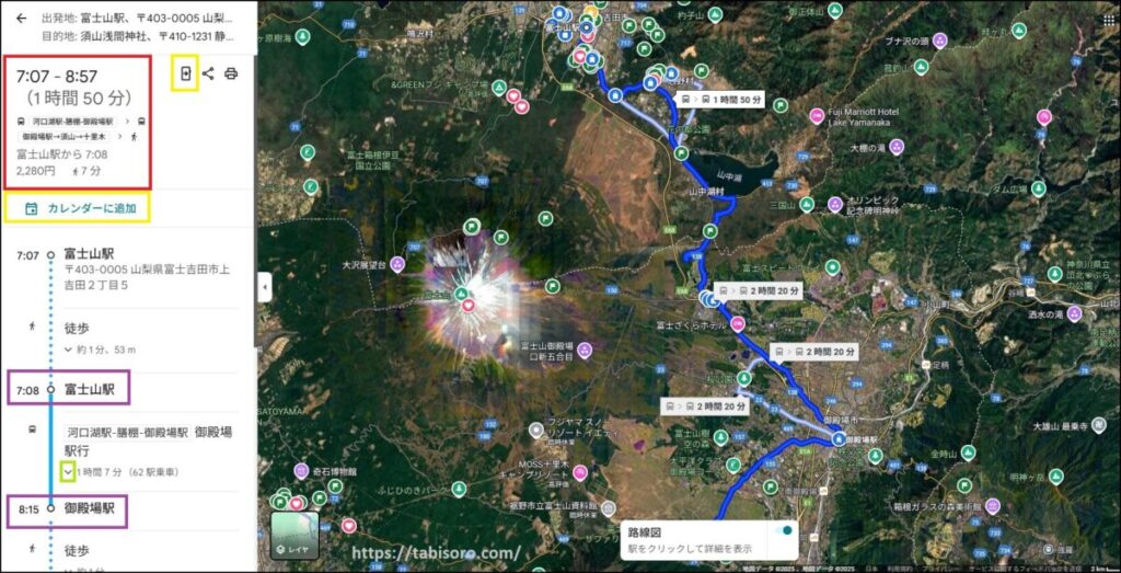 🌸 事前に検索して保存・スマホ・カレンダーの送信しておけば、初めての土地でも慌てずに移動でき、バス停も間違わず登録できるので一人旅の心強い味方になります。