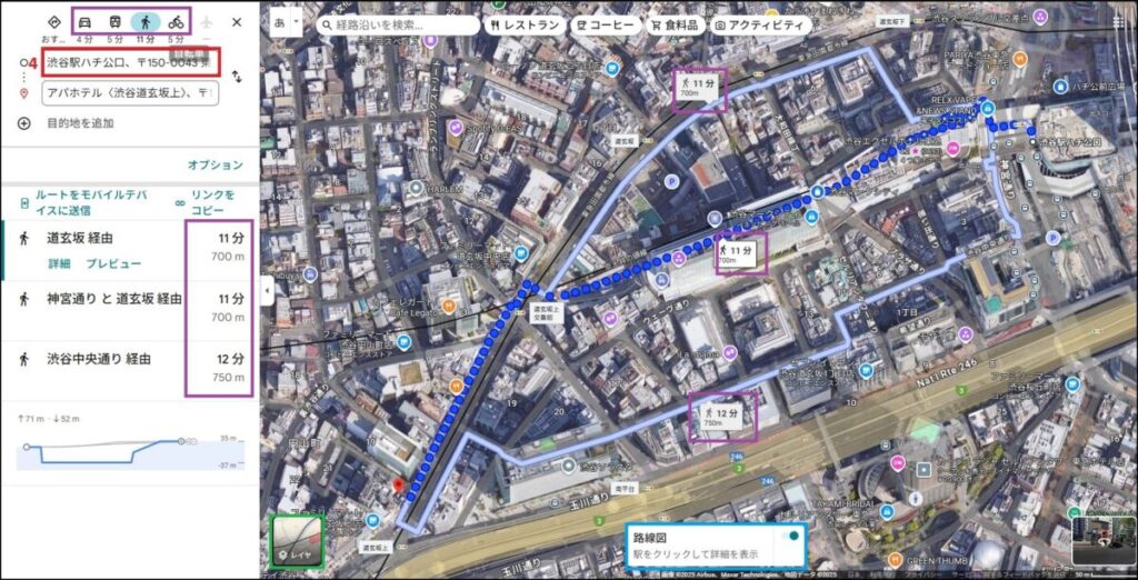 ・徒歩の三通りの経路(画像 薄紫)のそれぞれの距離、時間も分かります