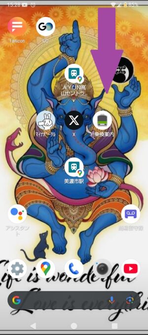 1 スマホトップ画面を紫 ↓ 上から下にドラッグ